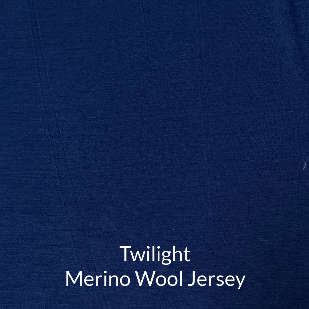 Twilight Superfine Merino Wool Jersey. $40.00. Piece is 58" long with a stitched 6” long tear 1” from the cut up to 18” from the selvedge. Some stretch marks surrounding the stitched tear. Fabric is 57 - 59" wide, 4.4 oz/sq yd or 150 gsm, 19.5 microns, 4-way stretch: 60% side-to-side 20% lengthwise